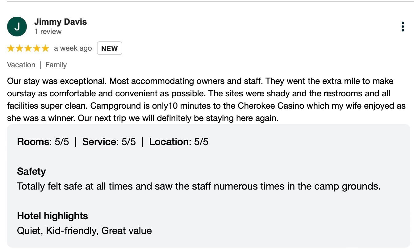 At Rustic Ridge, we take pride in offering a memorable camping experience with our well-maintained RV sites and cozy cabins. Don’t just take our word for it—hear from our guests who’ve enjoyed the serene atmosphere, scenic surroundings, and exceptional amenities. Whether you’re here for a relaxing getaway or an adventurous stay, our reviews highlight what makes Rustic Ridge the perfect choice for your next outdoor escape. Read on to see why guests keep coming back to Rustic Ridge!